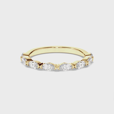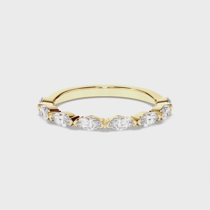 This stunning custom-made anniversary ring features a half band of marquise cut diamonds set on an 18ct gold band. Exuding fluidity in its line work, and boasting an elegant silhouette, as with all the pieces in our Bespoke Collection, this piece is made especially for you.