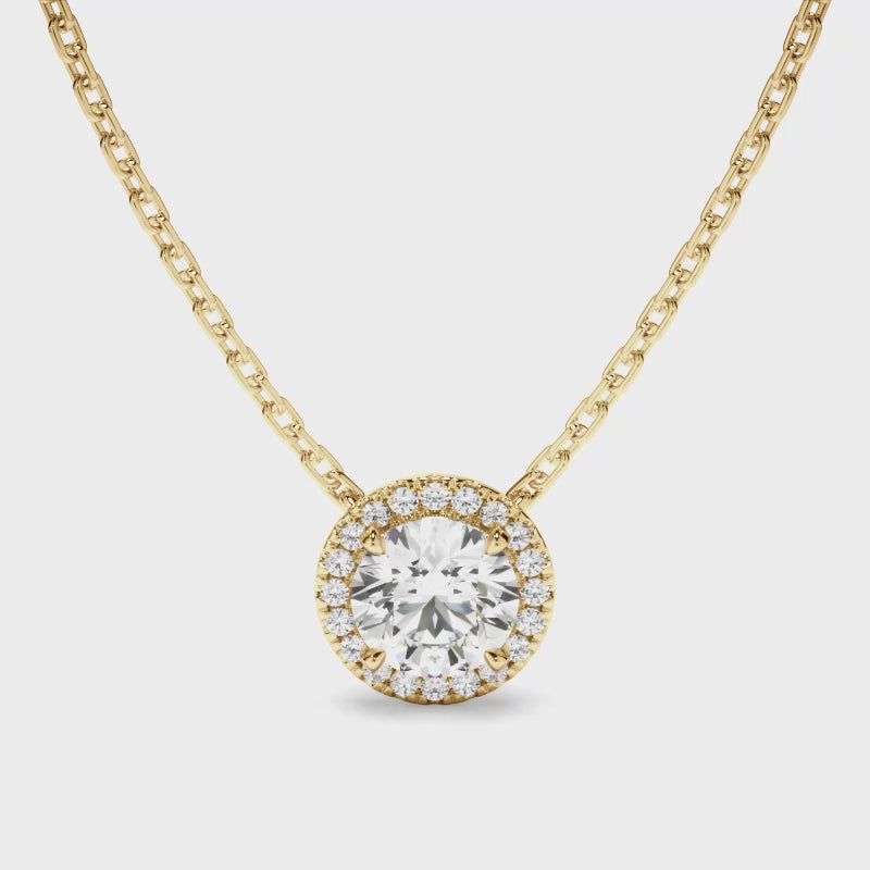 This elegant diamond halo necklet, made with your choice of diamond centre stone, features a minimum 0.10ct round brilliant cut diamond halo and includes a 45cm 18ct gold chain. Exuding fluidity in its line work, and boasting an elegant silhouette, as with all the pieces in our Bespoke Collection, this piece is made especially for you. Pictured here with a 1.00ct Round Brilliant Cut Diamond centre stone, a final price is determined following your centre stone selection.
